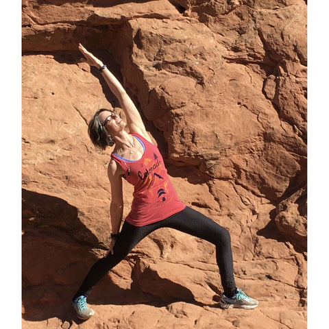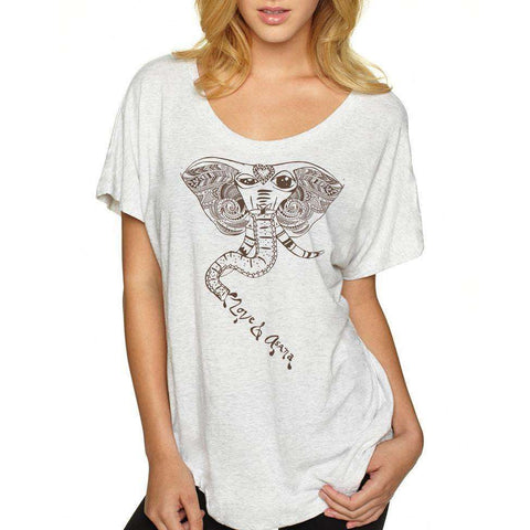 Exquisite signature hand-drawn elephant graces the front of this super soft long tank top with raw edges. Wear our winking elephant for good luck before or after practice!